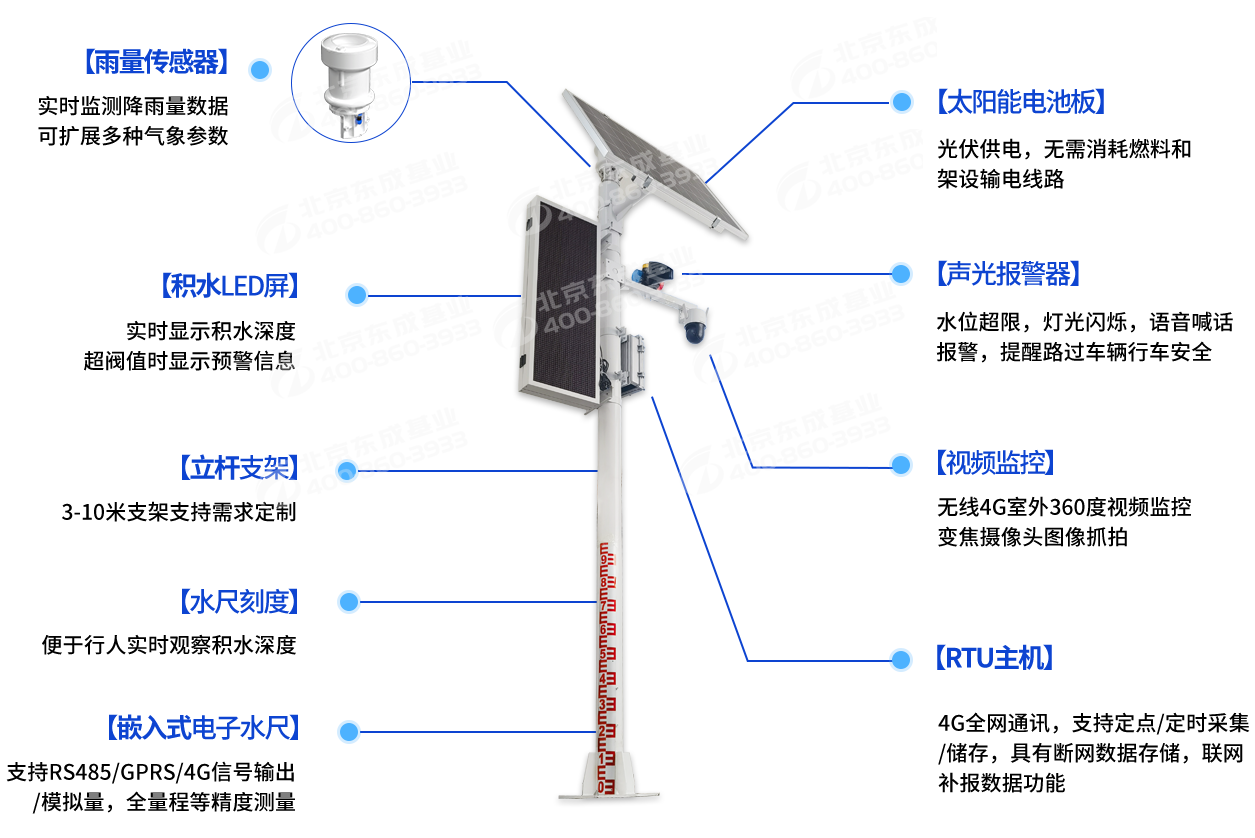 無需安裝地埋式液位計,通過立式燈桿上的水尺便可直觀觀測積水?dāng)?shù)據(jù),可因地制宜選擇4G(全網(wǎng)通)、網(wǎng)口等上傳方式。